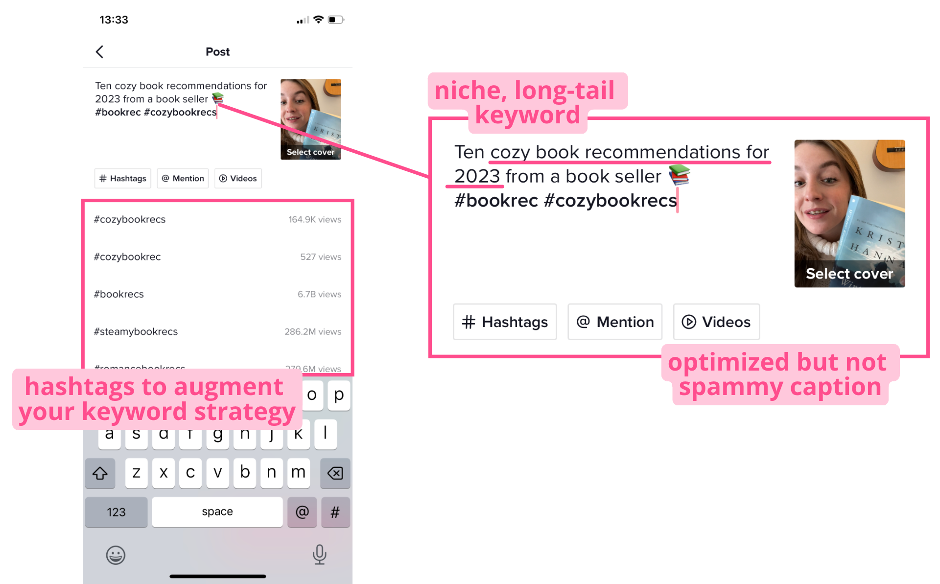 If you do want to add more keywords to the caption, TikTok hashtags are your friend. Yes, users will see them in the caption, but they're more forgiving of hashtags then just random word salad. TikTok shows you the views per hashtag right in the editor, too, so it's easy to add the right ones and give your video that extra boost.