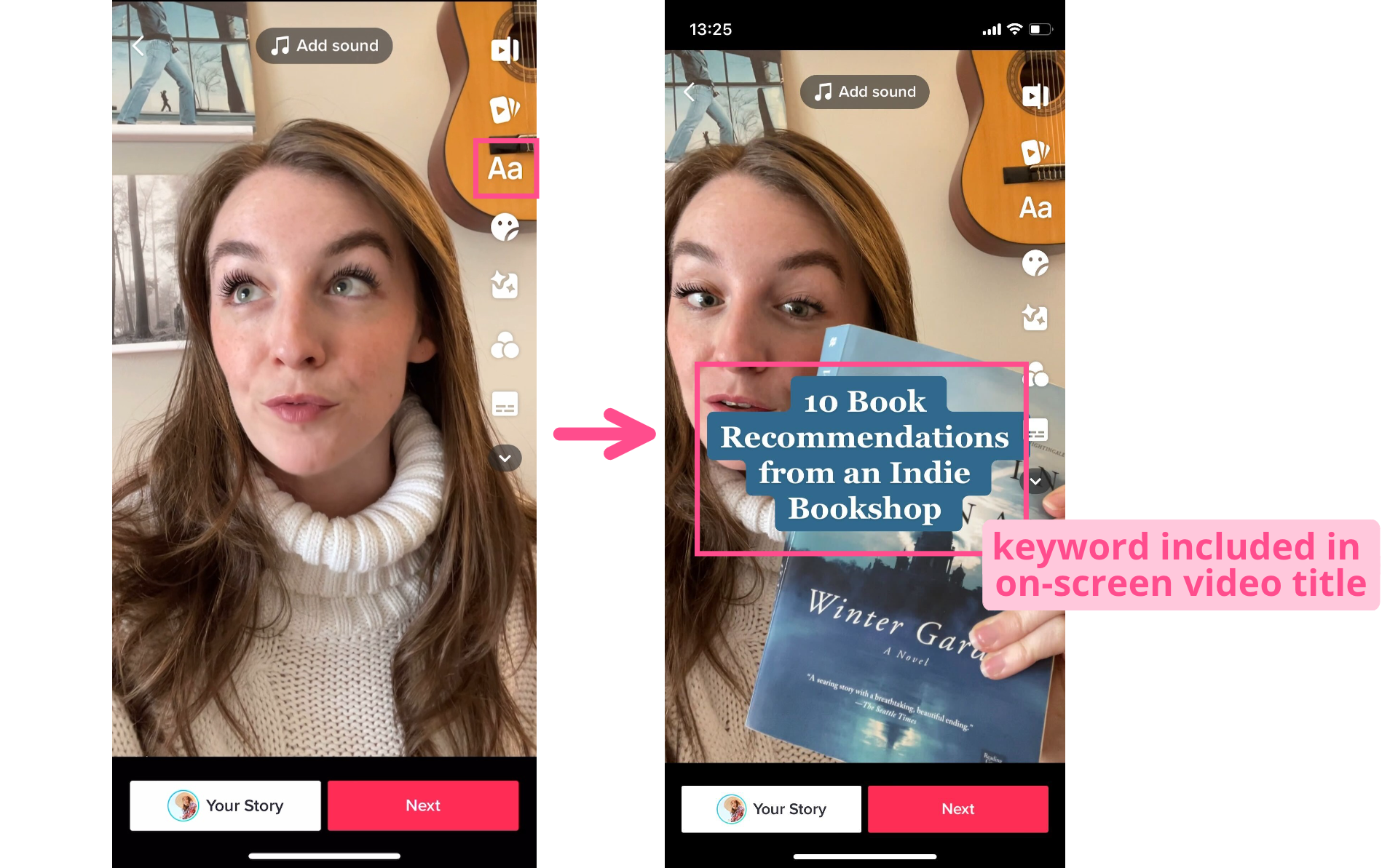 You can add your primary keyword as part of an on-screen title or caption, to make your video more eye-catching in the search feed. To stick with the "book recommendation" example, that might look like, "Ten Book Recommendations from an Indie Bookshop."