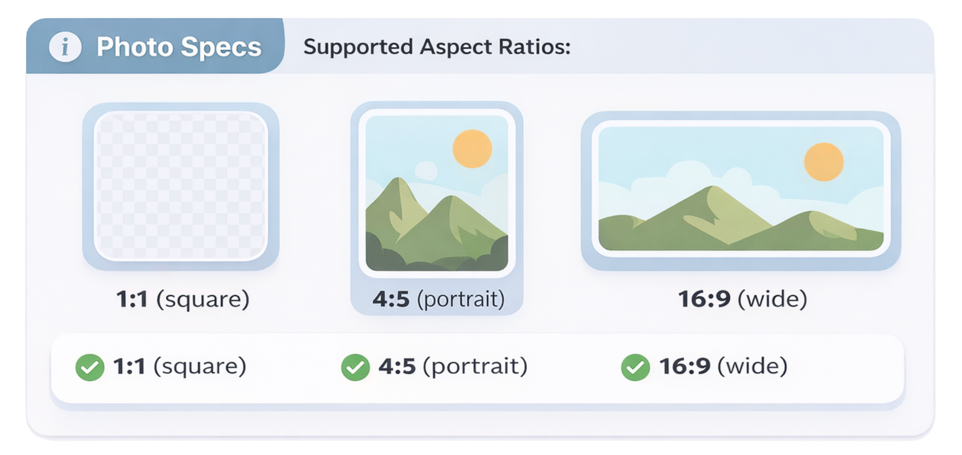 | Photos | Up to 10 images per post; supports 1:1, 4:5, 16:9, 9:16 |