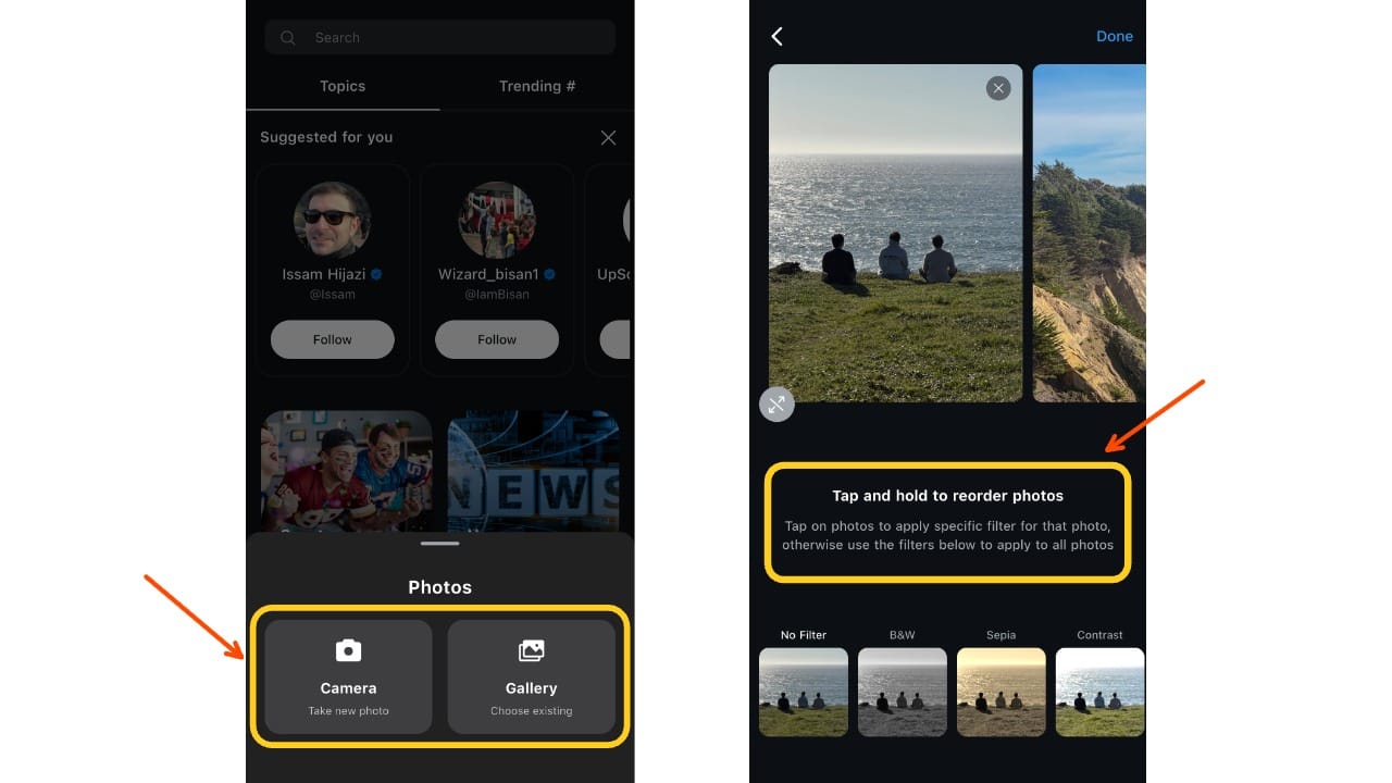 Upload from your camera roll or use the in-app camera. You can pinch to crop, reorder photos, and preview your post before publishing.