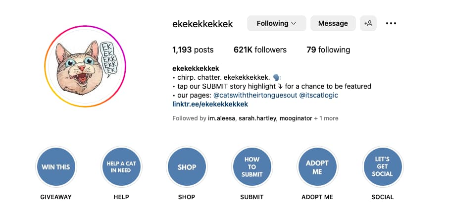 This account on Instagram, all about that funny chirping/chittering thing cats do when they see a bird or rodent, makes it clear how to submit your UGC to be featured on their page.