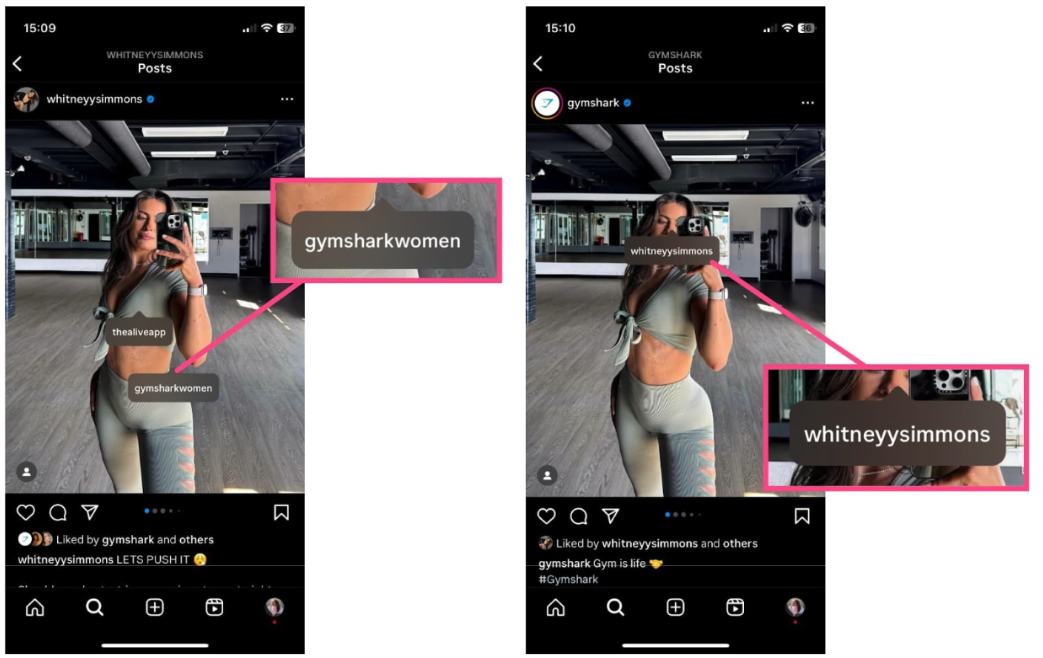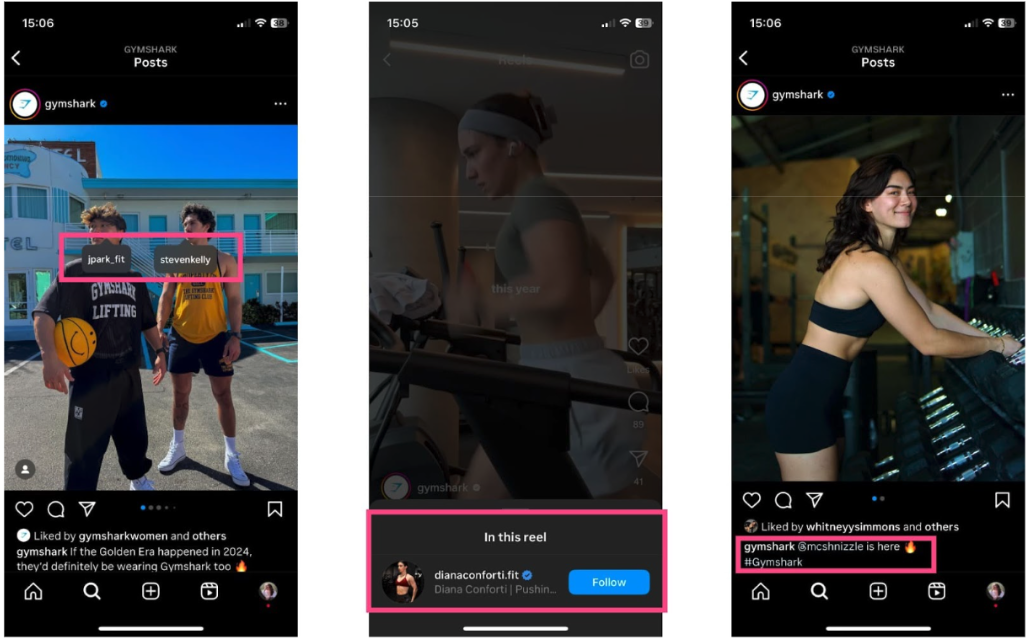 To be featured, the creator tags or mentions Gymshark in content where they’re wearing or showing a Gymshark product. Some of these brand ambassadors may go on to develop deeper relationships with the brand, collaborating on product launches or attending live events.