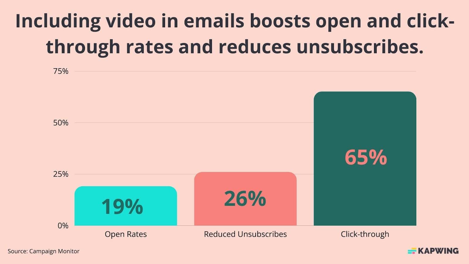 Just teasing that your email contains a video can boost your open rate. SuperOffice found that including the word “video” in a subject line boosts the open rate by a cool 6%. And, according to Campaign Monitor, including video in email marketing boosts open rates by 19%, click-through rates by 65%, and reduces unsubscribes by 26%.