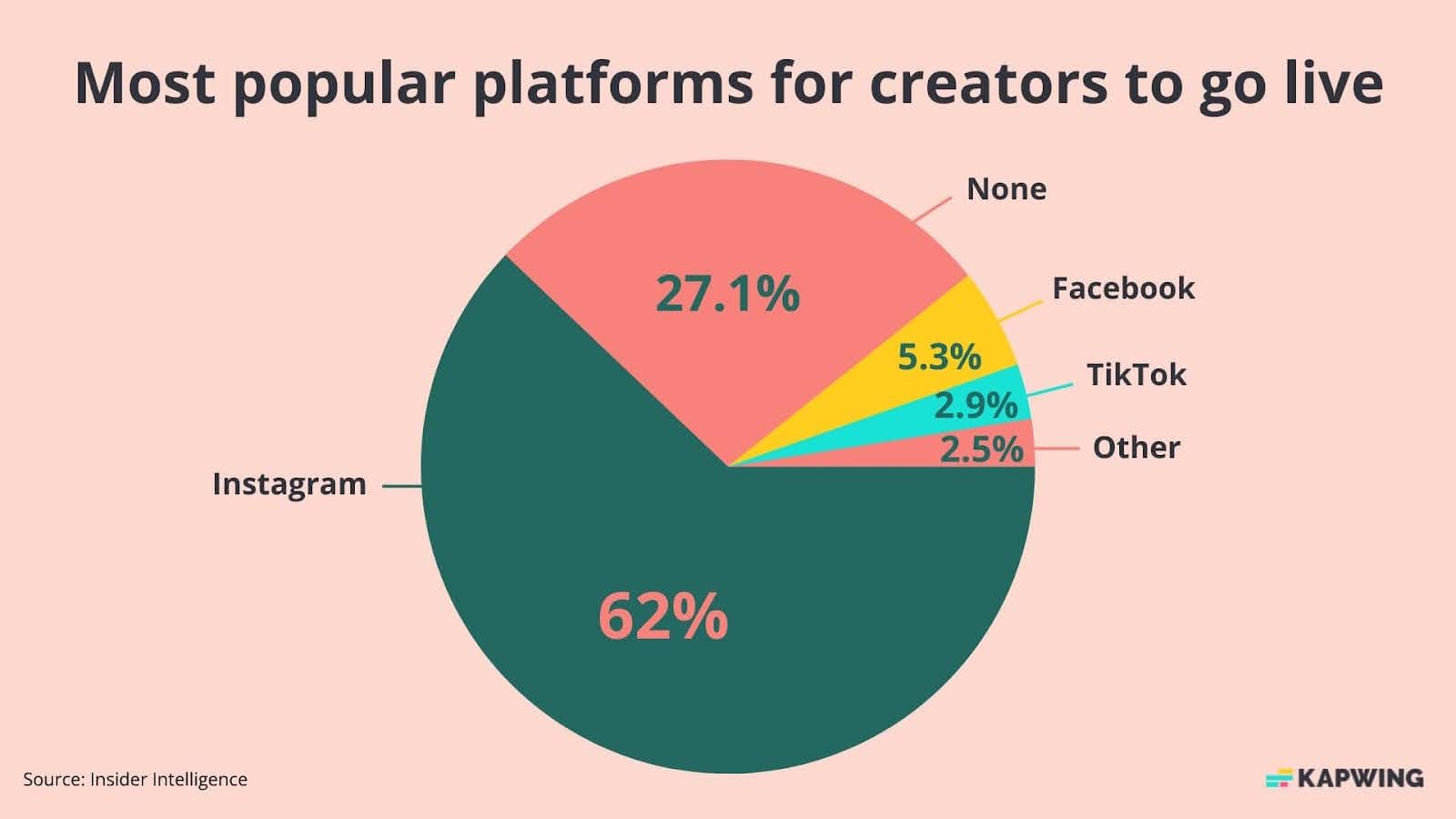 Insider Intelligence reports that there are 163.4 live video viewers in the US in 2023. As well, 24% of US internet users ages 16 to 64 began watching live video during the pandemic. Although platforms like Twitch and YouTube seem most synonymous with live video, the most popular platform that creators use to go live is Instagram, at 62.1%. Facebook is next at 5.3%. Live videos are even stealing attention away from TV — 44% of people said they watch less live TV because of online streaming.