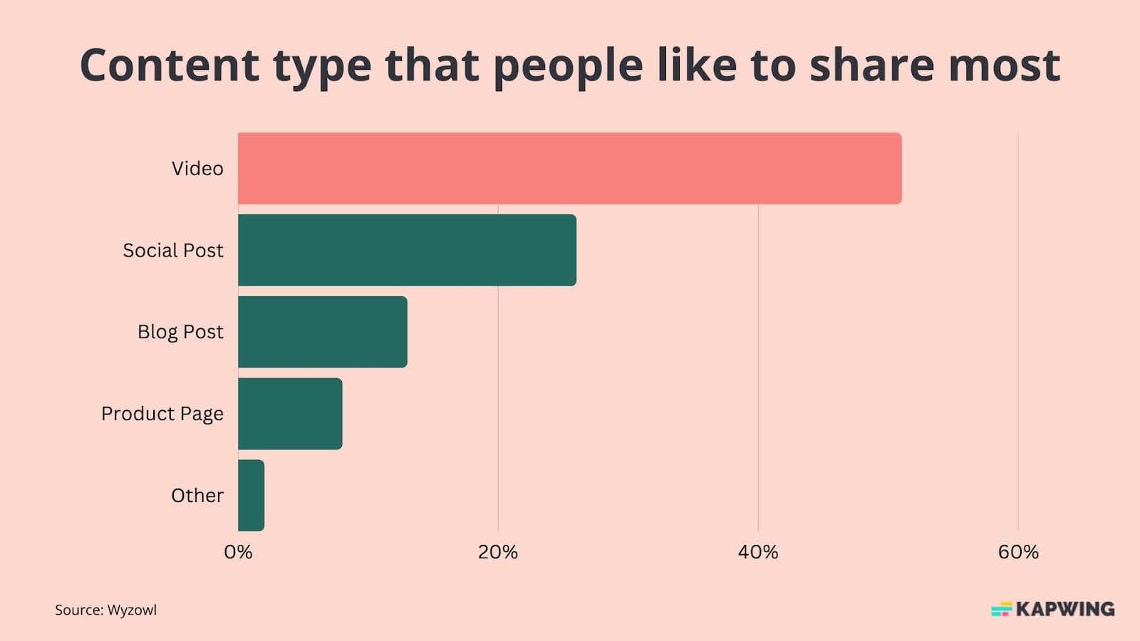 Video is also the most shareable type of content on the internet. According to Wyzowl, 51% of people are more likely to share a video with their friends compared to every other type of content marketing. For context, 26% are likely to share a social media post, and just 13% are likely to share a blog post.