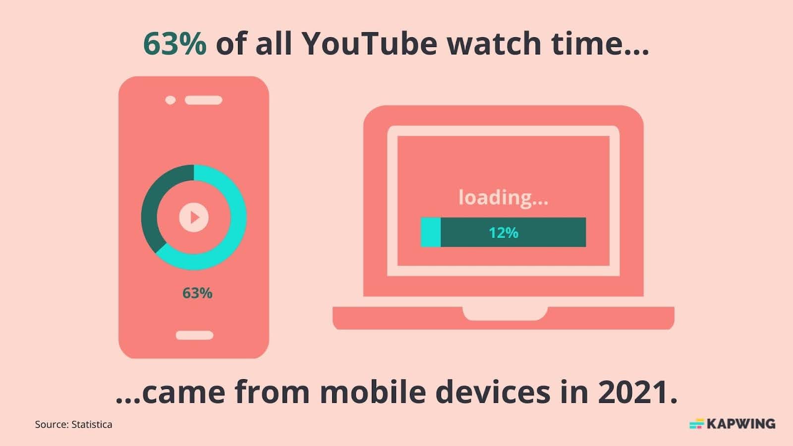Data shows about 90% of video is watched on a mobile device and the average person watches 25.7 minutes of video on their mobile device every day. According to Statistica, 63% of watch time on YouTube came from mobile devices in 2021, compared to just 12% on desktop.