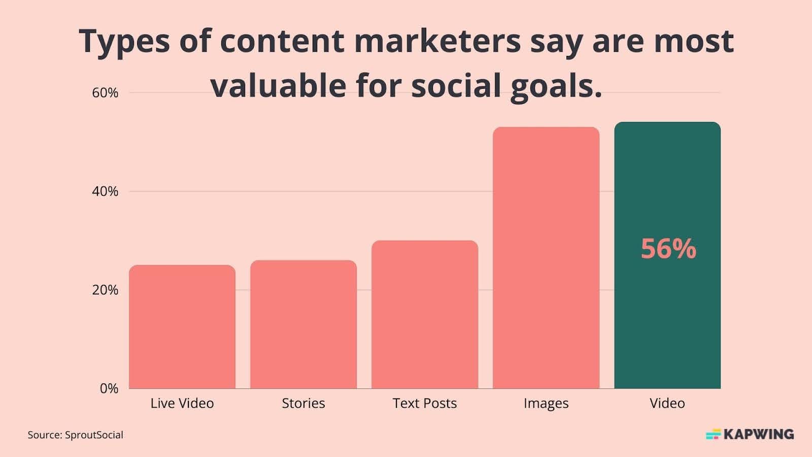 According to Sprout Social, marketers also agree that video is the best thing to post on social media, with 54% saying it’s the most valuable for meeting social media goals. That’s followed by images at 53%. Live video also makes an appearance, with 25% of marketers using it.