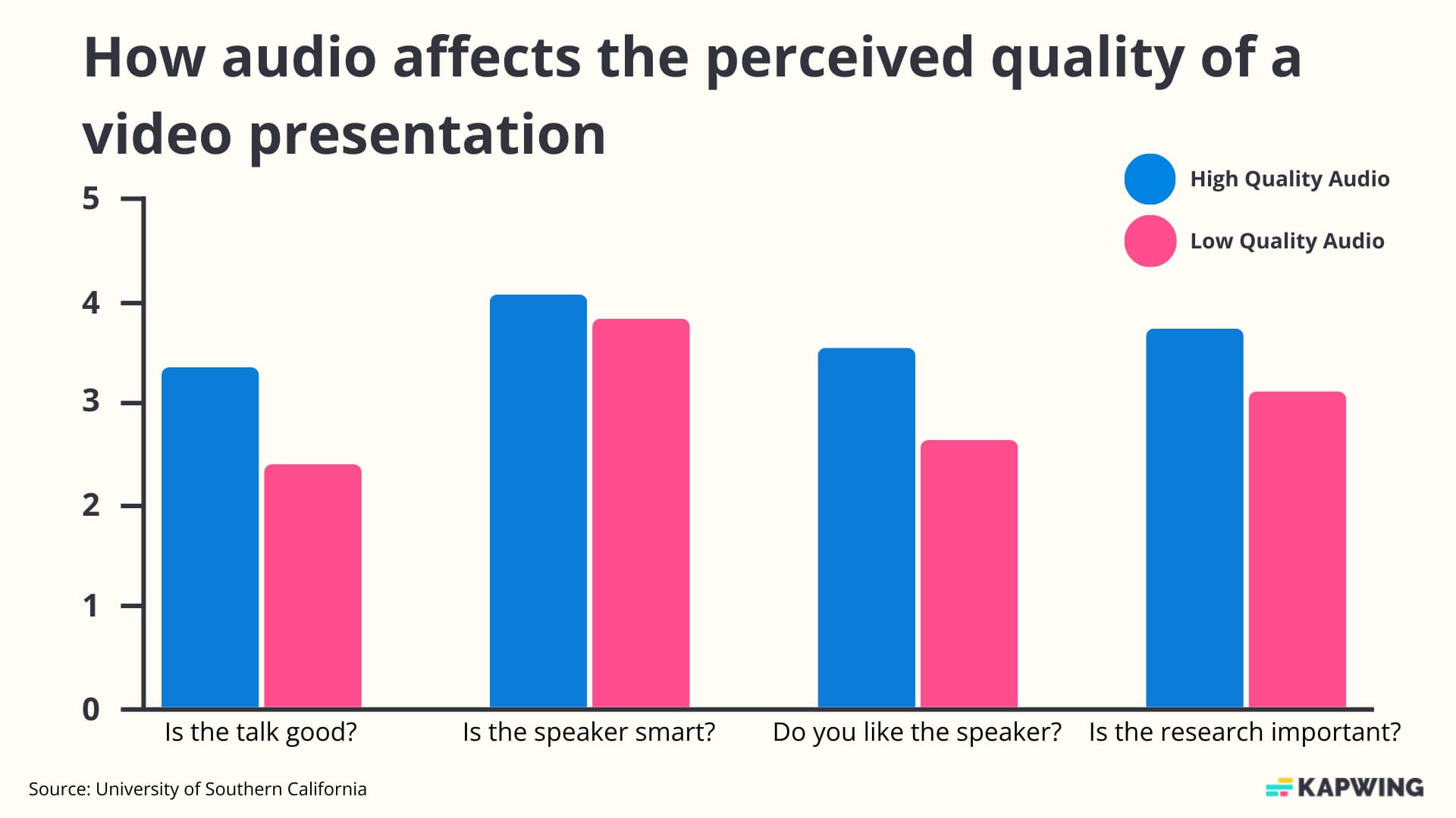 According to a 2018 study, poor audio quality causes viewers to rate the content and its source lower across multiple dimensions. Researchers found that videos with bad audio are seen as less trustworthy, less important, and less substantive—and the speaker was seen as less likable, too.