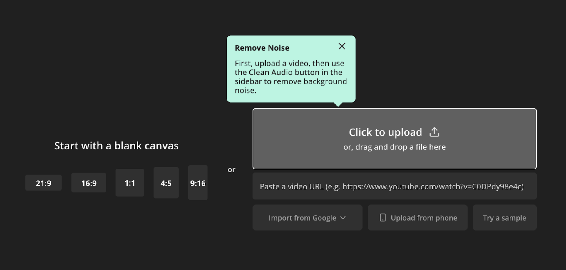 Once your video is uploaded, select the "🔊Clean Audio" feature from the right-hand sidebar of the Kapwing editor. You don't need to change any other settings if all you're looking to do is improve your video's audio quality without manual edits.