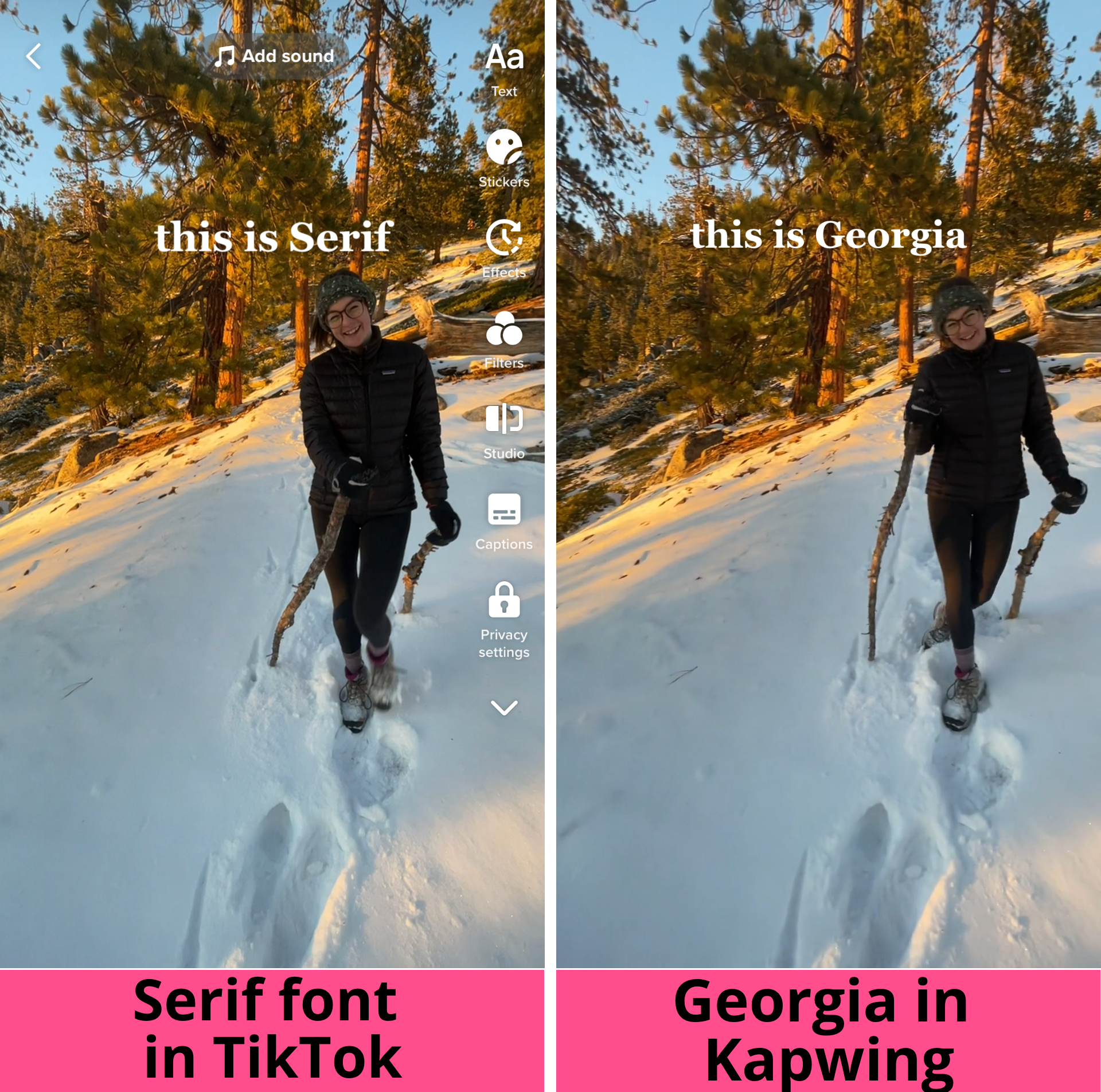 This is the only serif font in TikTok’s editor, meaning it has the small decorative strokes at the ends of letters that give it a more traditional, bookish look. The best match is Georgia Bold, a royalty-free font you can use in personal and commercial projects. Just make sure to bold your text so it holds the same line weight as TikTok's Serif font.