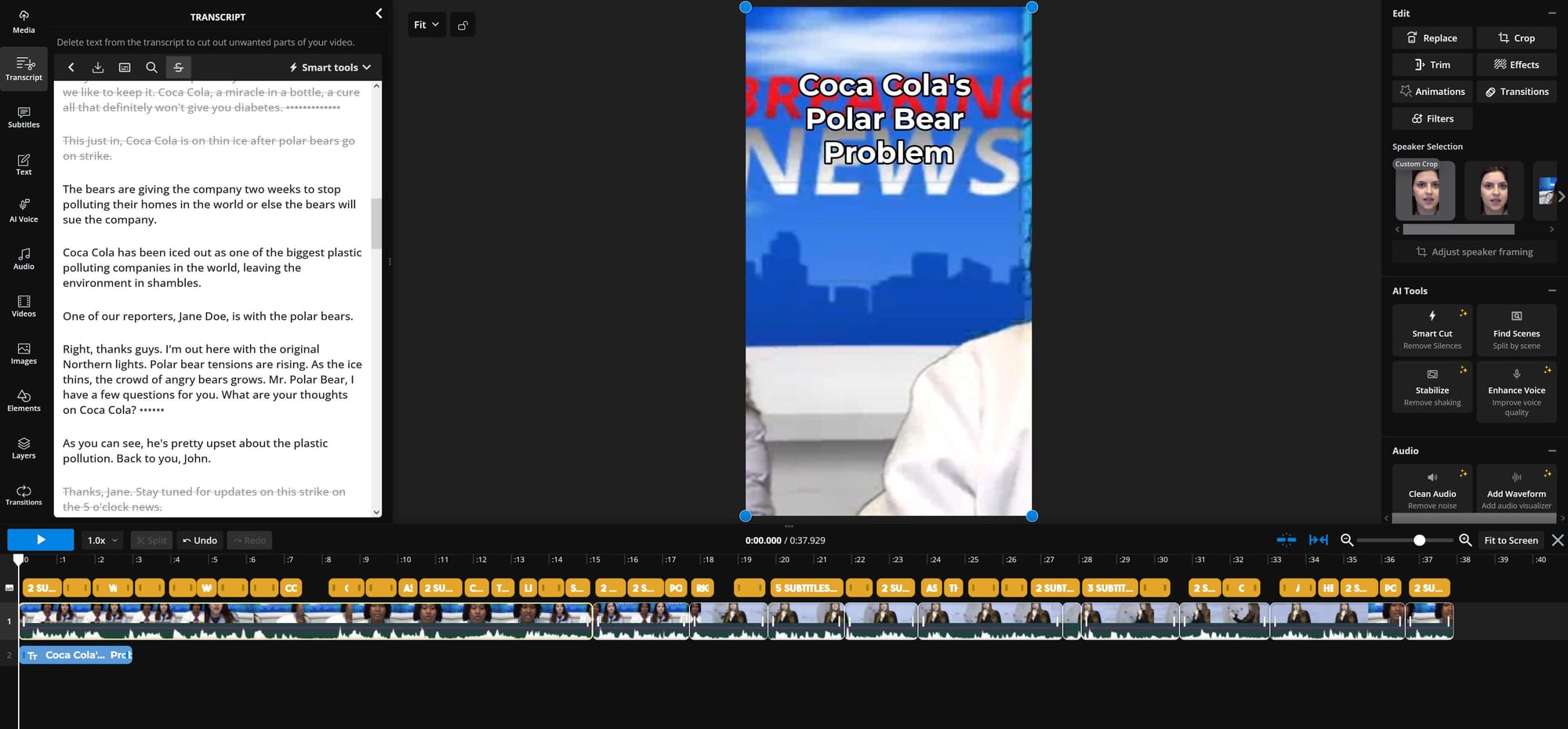 To refine a clip, select any of the highlighted editing options. Each repurposed video comes with automatically generated subtitles and a visible script, allowing you to easily review and edit specific sections. Once you've made adjustments, your clip is ready to export and share on TikTok or any other short-form platform.