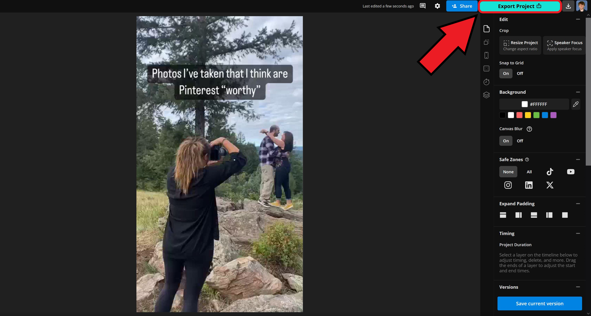 After uploading your video to the editor, locate the Export Project button in the top right corner.
