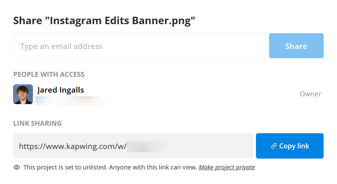 Then, simply copy the provided project link or enter an email address to send it instantly to others.