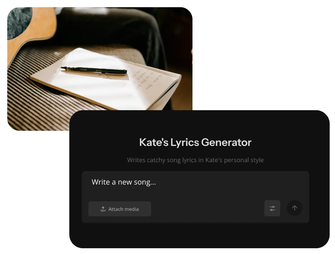 Загрузи свои отрывки текстов и позволь AI от Kapwing закончить их, или избавься от творческого кризиса, создав полную песню с нуля. Ты даже можешь переделать существующие тексты, добавив личные штрихи вроде названий мест, брендов или имён, сделав каждую песню по-настоящему своей.