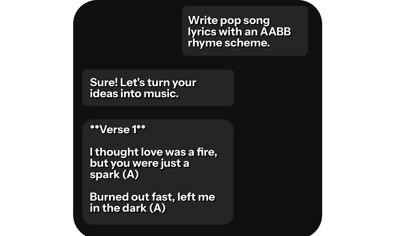 You can generate song lyrics with any rhyme scheme by simply specifying it directly in your request. Whether you want AABB, ABAB, or more complex patterns like AABCCB — just write the structure you need, and the AI will stick to it. The generated song lyrics will be marked to clearly show the rhyme scheme.