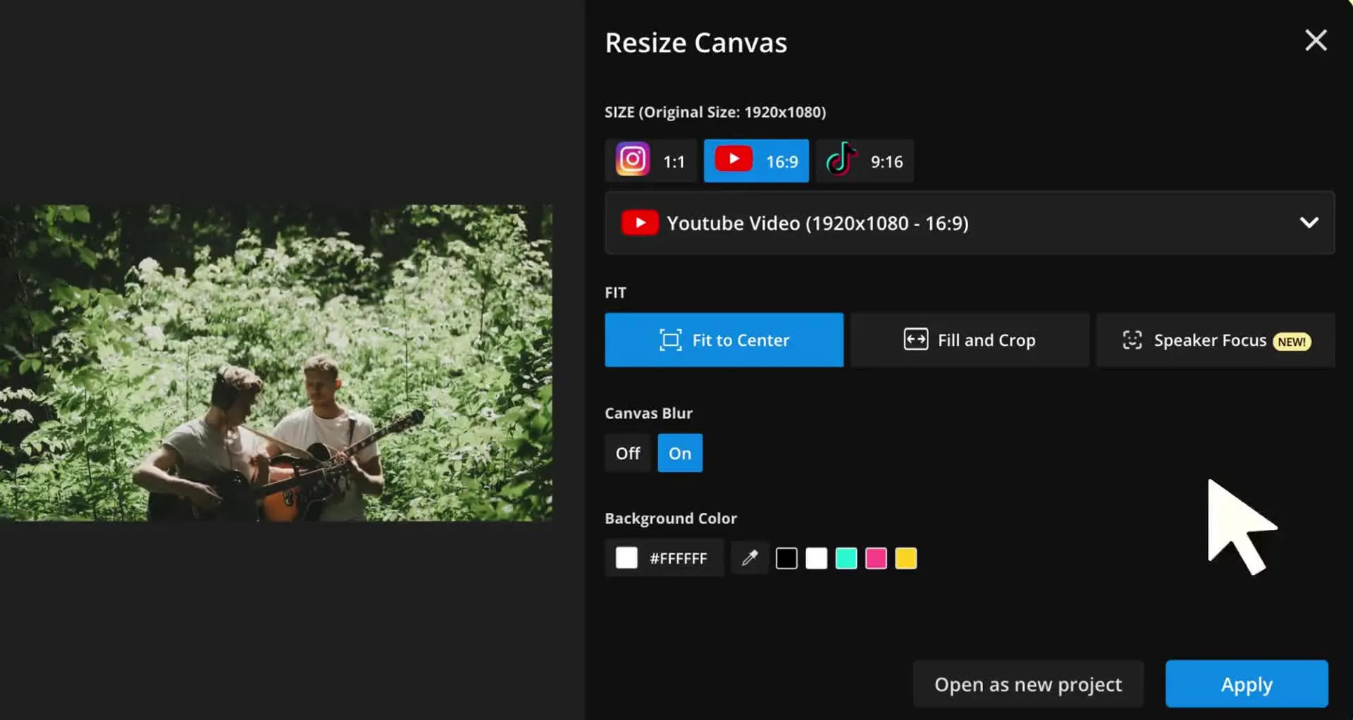 To change the aspect ratio of a video, upload your content into Kapwing or paste the video’s URL. Then click “Resize Canvas” and choose the correct aspect ratio or social media platform you’re creating content for. Kapwing will then offer multiple ways to resize your video, including Fit to Center, Fill and Crop, and Speaker Focus, so you can zoom in on the right content or add margins. With Kapwing, it’s easy to test out different resizing options and choose your favorite.
